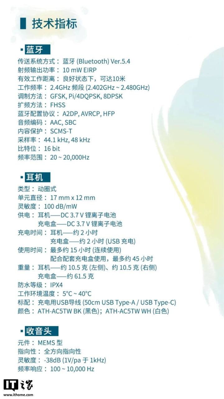 铁三角ATH-AC5TW开放式无线耳机现已在京东开售,国行定价799元,IT之家附参数表如下: